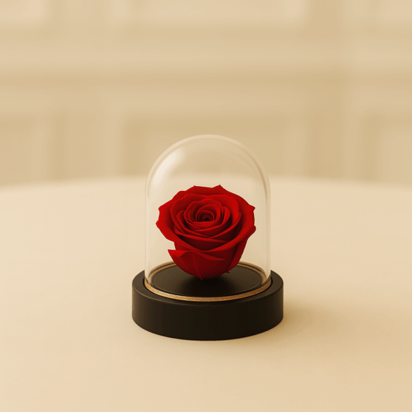 Rosa preservada de color rojo, en cúpula de dimensiones 7cm*6cm